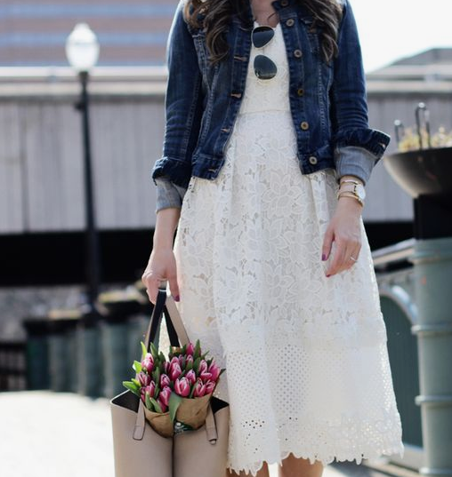 Denim jacket with a all white lace dress will make you look effortlessly beautiful. Even you can team up a simple white T-shirt and white trousers with a denim jacket. Finish your look with some chunky accessories.