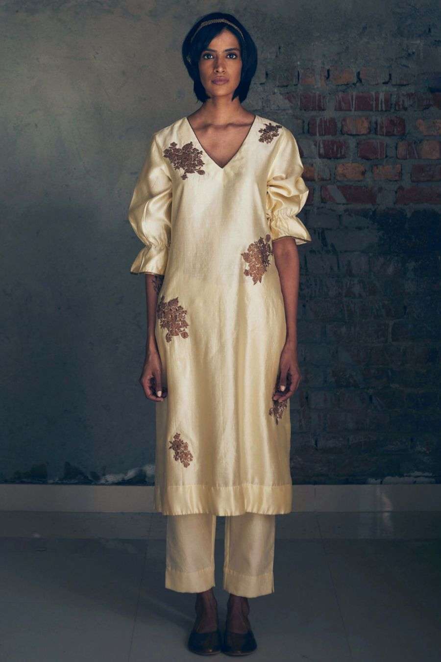 Ivory is a rich colour, and this being complimented with its brown traditional designs definitely makes it one of the prettiest puff sleeves design for suit.